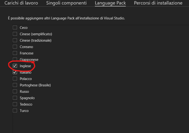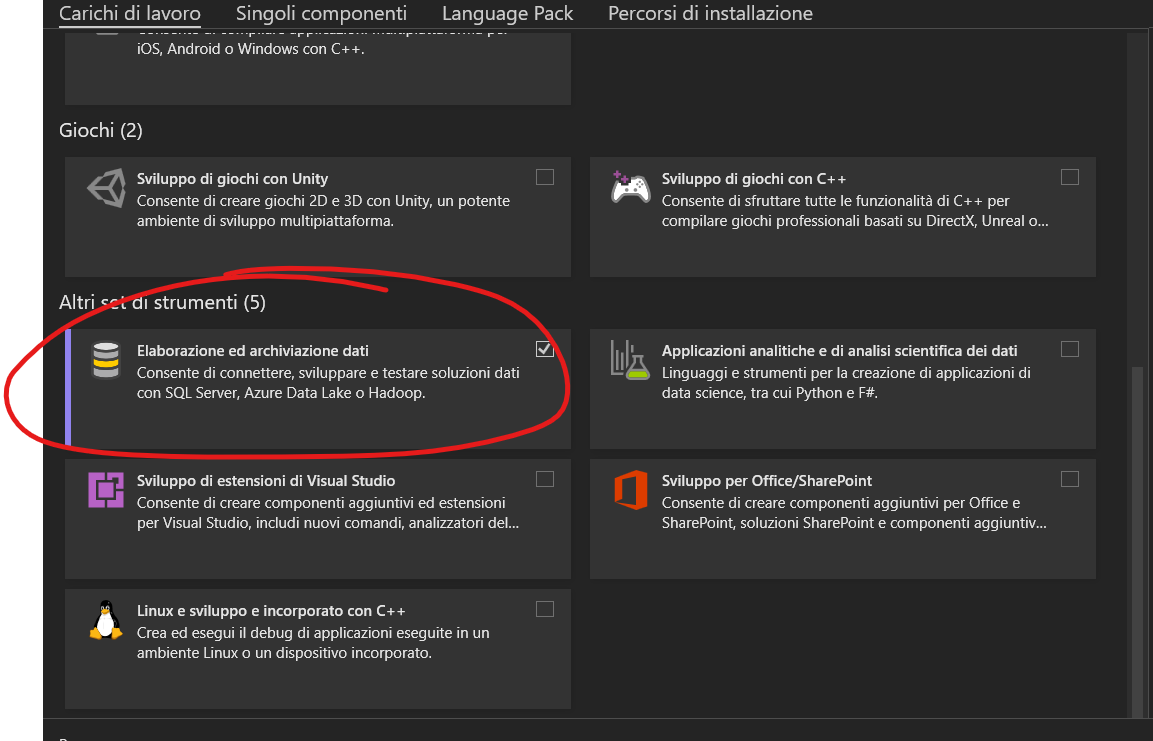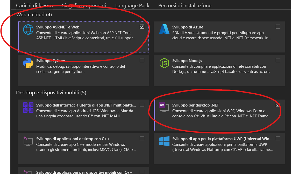 È importante selezionare i pacchetti giusti. È possibile in seguito all’installazione modificare i pacchetti installati cercado su start Visual Studio Installer.