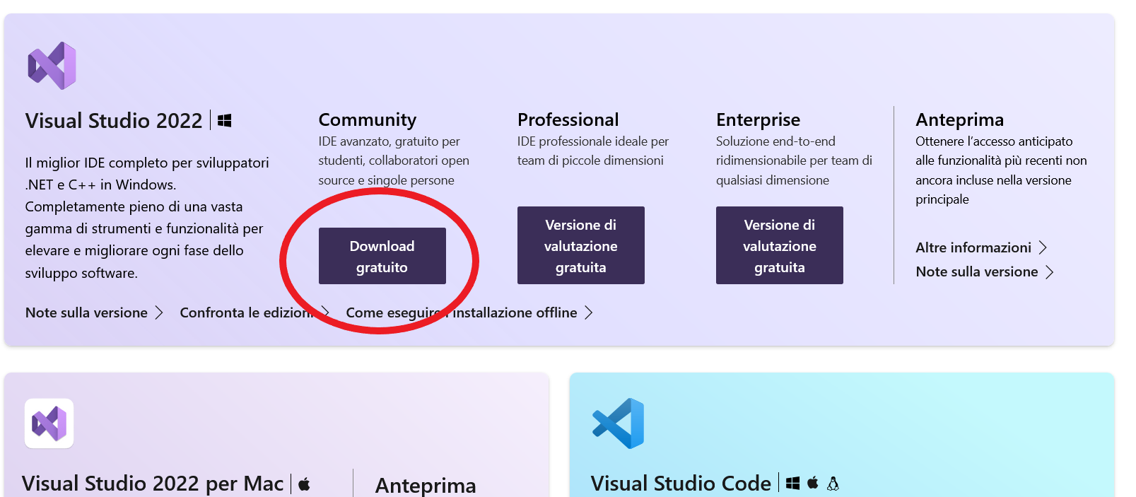Scaricare dal link seguente l’ultima versione dell’installer di Visual Studio Community Edition:
